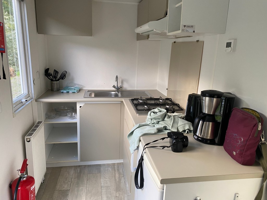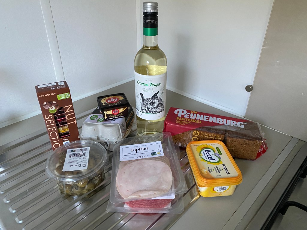 After exploring the area, I picked up some basic groceries at the mini-mart on site at the EuroParc. The store is well-equipped with anything anyone might need while camping: groceries, toiletries, even things like s’mores kits, board games, and postcards. I bought cheese, bread, and wine for my dinner which I ate outside at my little table overlooking the water.