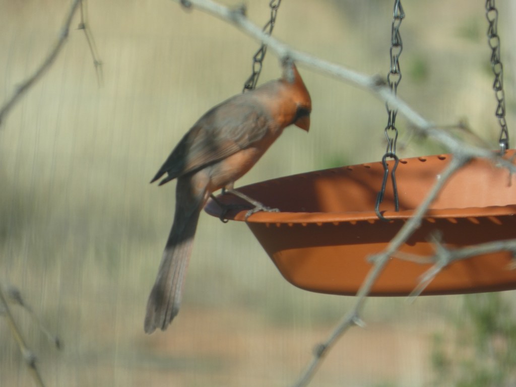 The second bird to be added to the Wingsong lifelist was the Northern Cardinal. Now, I’ve heard this bird many times but haven’t seen it yet. Today, one was sitting in the tree in the back, right by one of the windows! It checked out the water basin and then the tube feeder, but didn’t bother to eat or drink. Then, it flew up into a tree, perched, and started singing away!! After that, it went to the front and decided to have a nibble from the front yard feeder. Because of the muted colors, I think it’s a female.